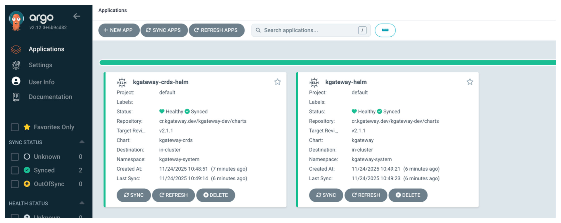 kubectl apply -f- <<EOF apiVersion: argoproj.io/v1alpha1 kind: Application metadata: name: kgateway-helm namespace: argocd spec: destination: namespace: kgateway-system server: https://kubernetes.default.svc project: default source: chart: kgateway helm: skipCrds: false parameters: - name: controller.image.pullPolicy value: "Always" - name: controller.extraEnv.KGW_ENABLE_GATEWAY_API_EXPERIMENTAL_FEATURES value: "true" repoURL: cr.kgateway.dev/kgateway-dev/charts targetRevision: v2.2.0 syncPolicy: automated: # Prune resources during auto-syncing (default is false) prune: true # Sync the app in part when resources are changed only in the target Kubernetes cluster # but not in the git source (default is false). selfHeal: true syncOptions: - CreateNamespace=true EOF - Development builds: